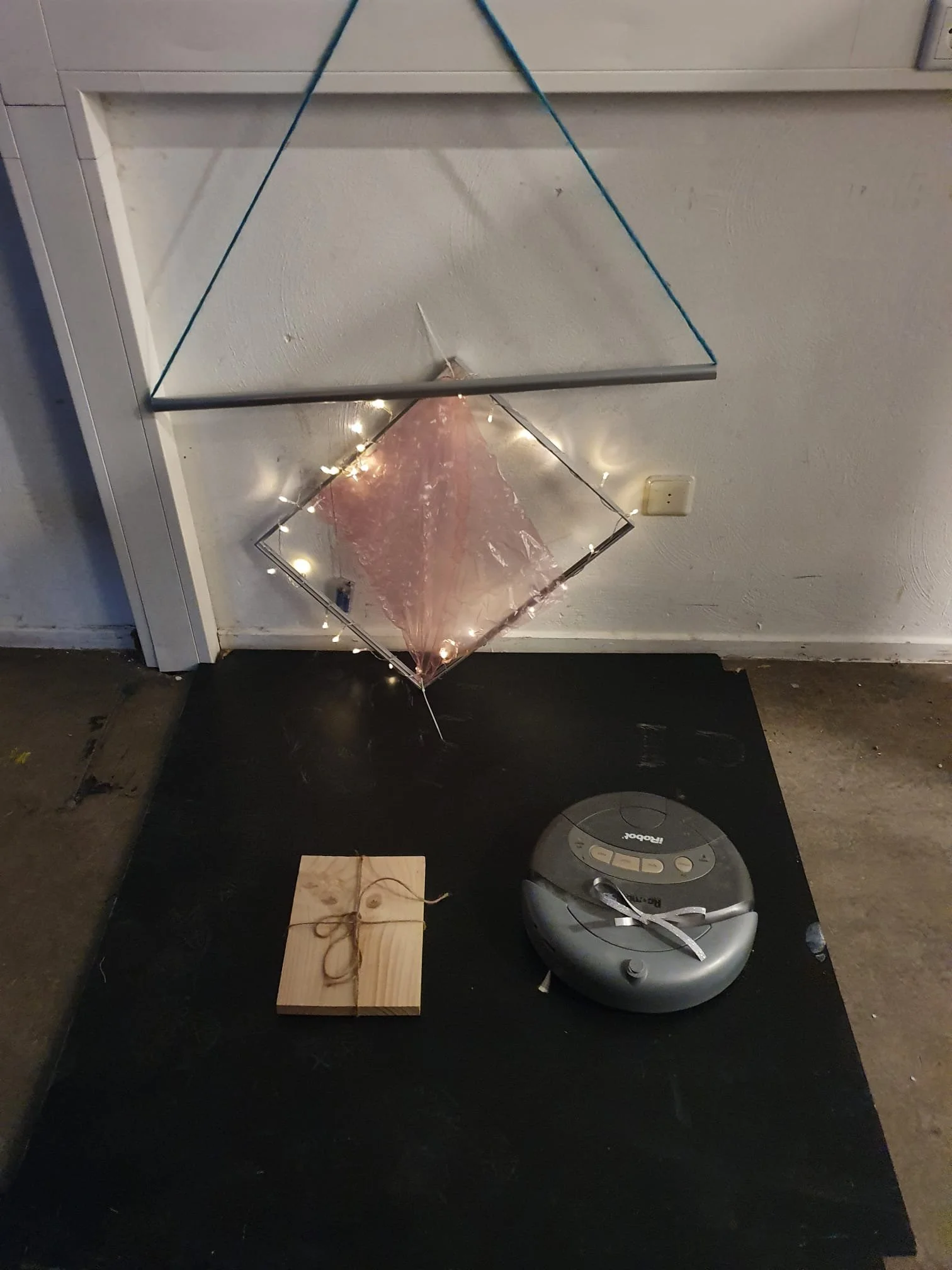 De Roomba en het blok hout, dat zijn wij 2022, hout, Roomba, lampjes, bubbelplastic, fotolijst, lintGemaakt met Ilse Bakker