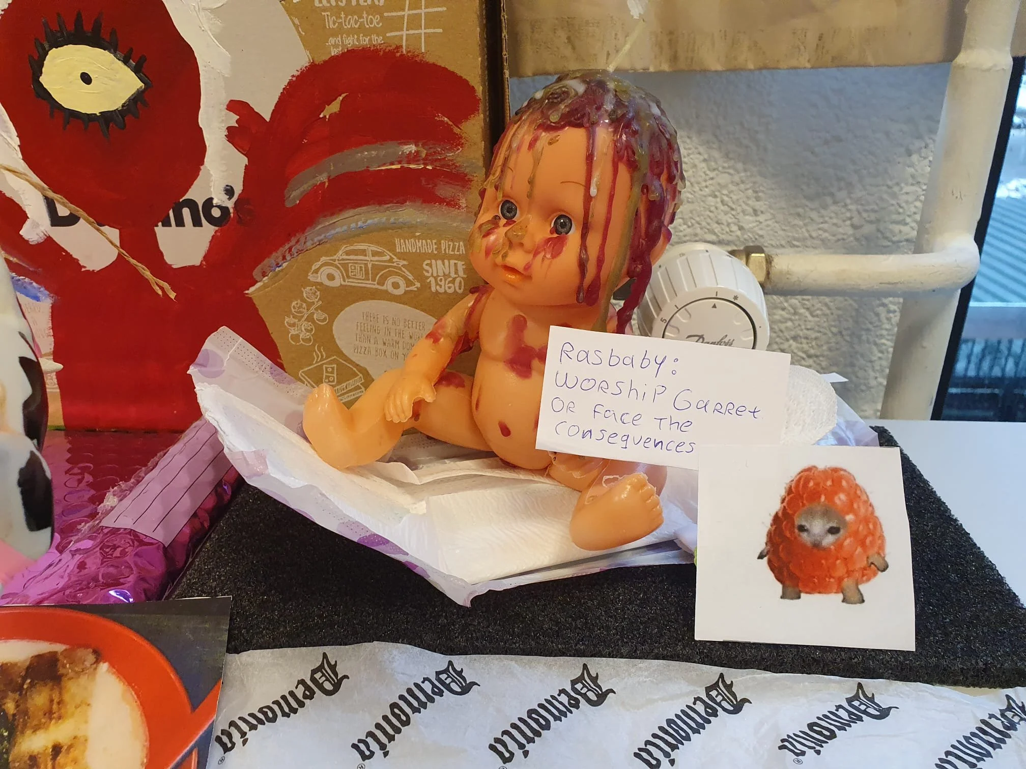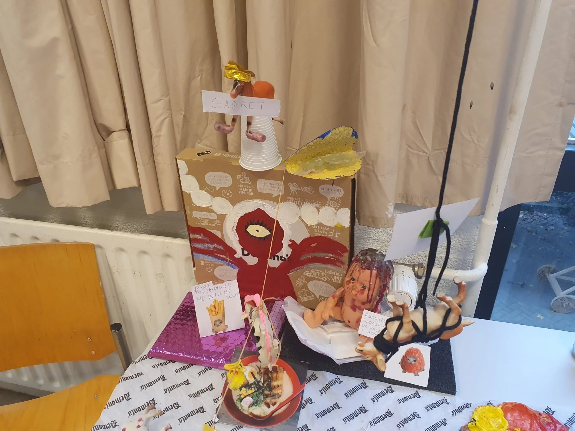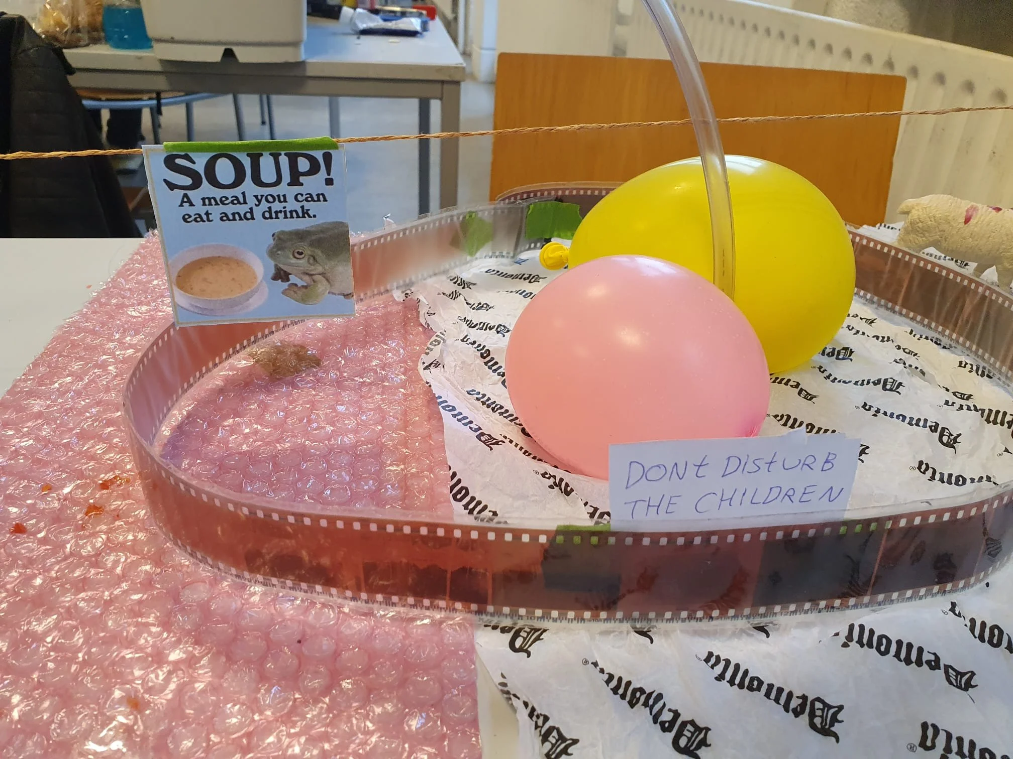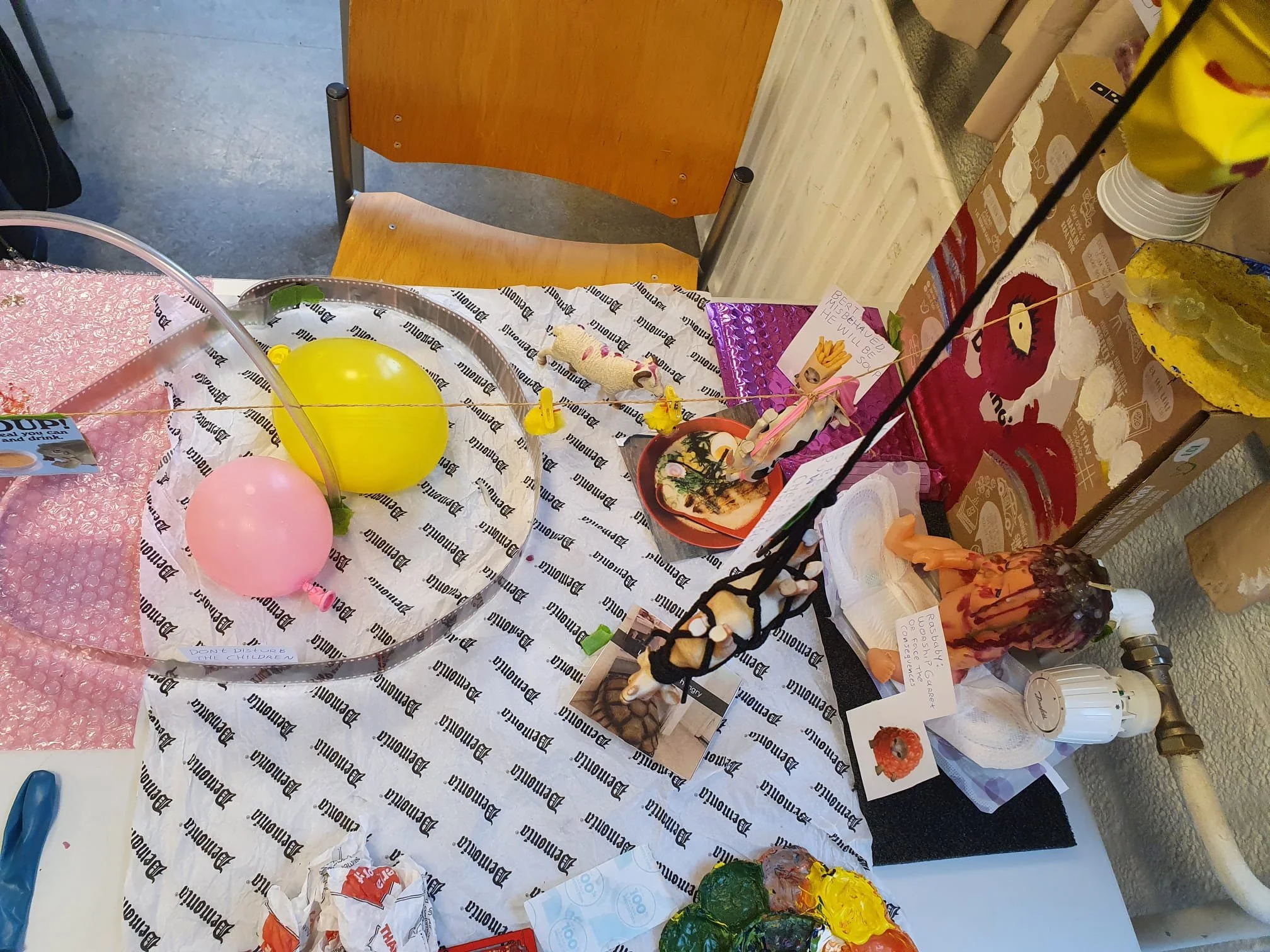 2021, kurk, acrylverf, fotorol, karton, plastic speelgoed, kaarsvet, ballonnen, touw